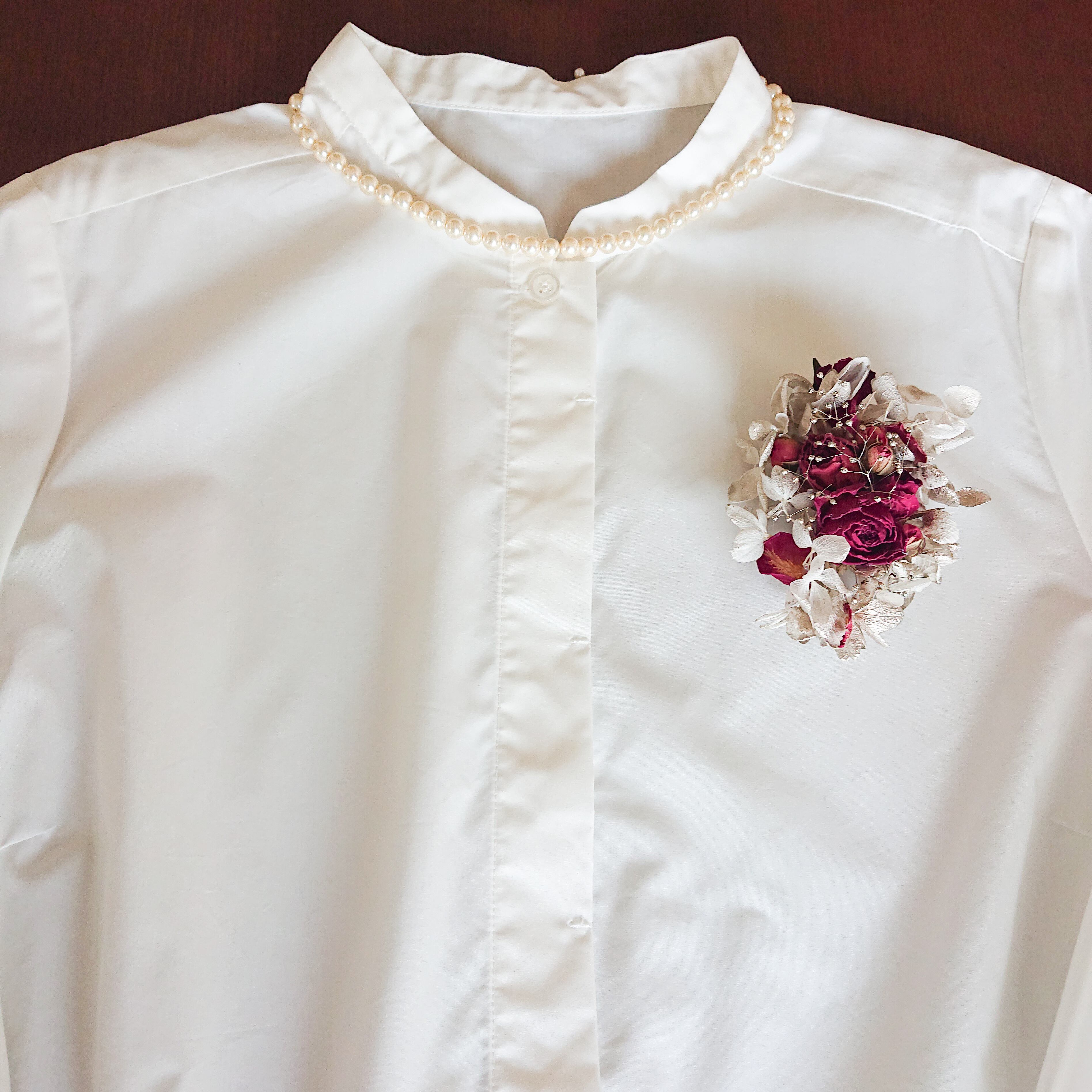 ドライの薔薇を使ったコサージュです。ヘアクリップとしても2way使用可能。