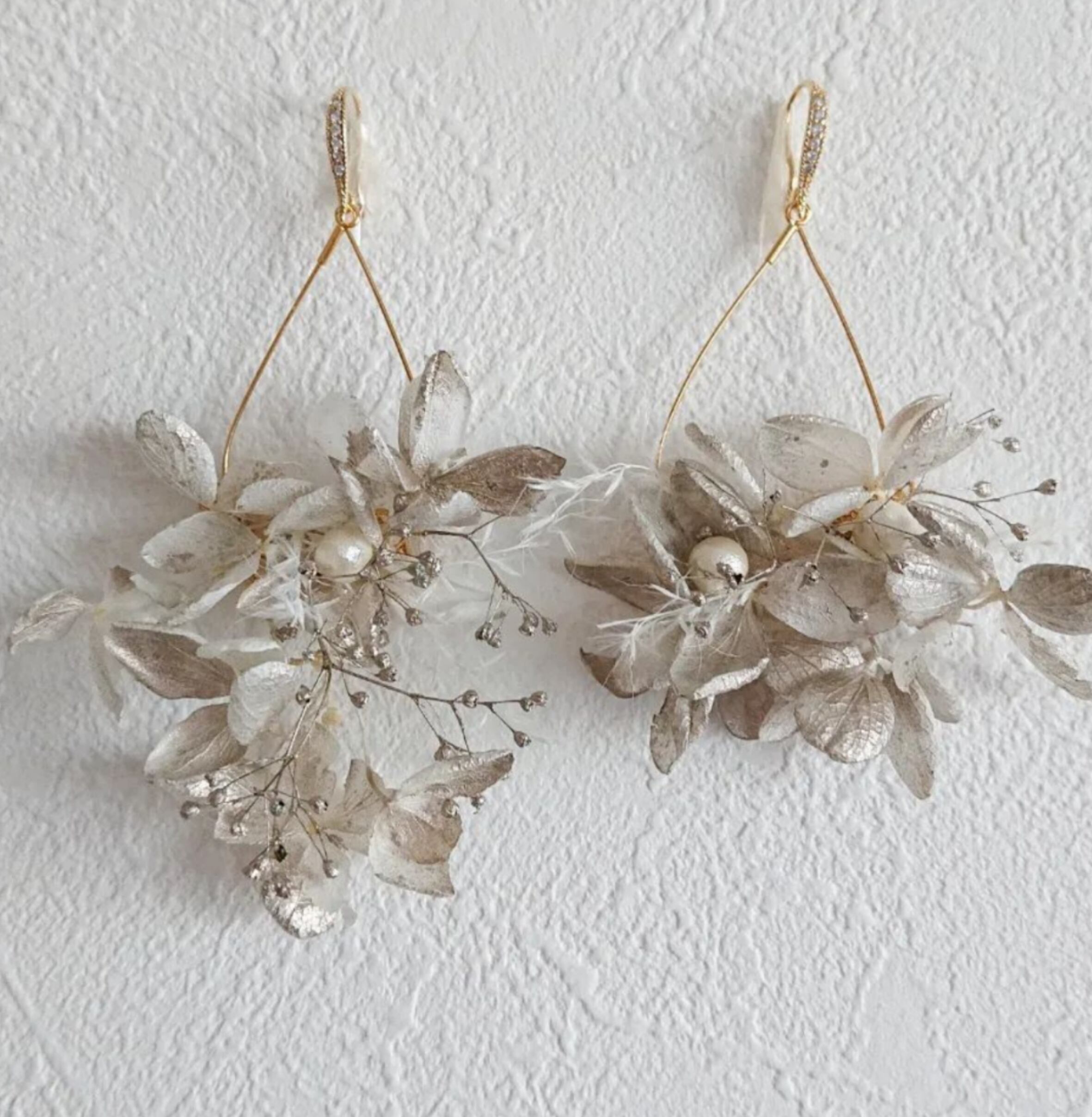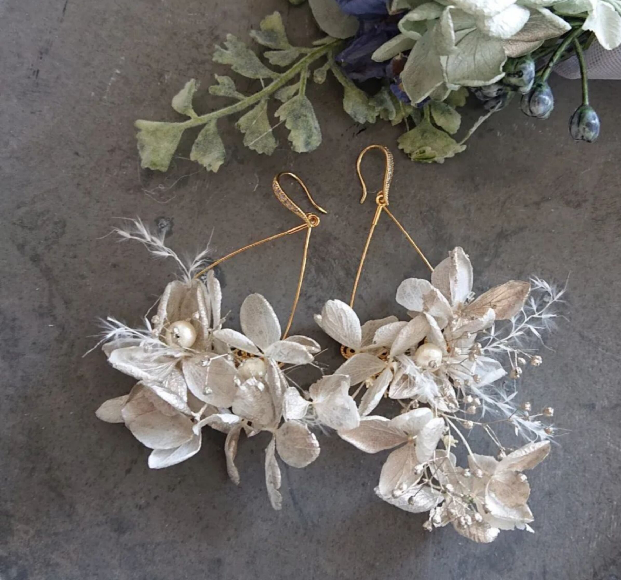 繊細な白とゴールドのヴィンテージカラーの紫陽花とコットンパールを雫型のフレームに組み合わせた美しいピアスです。