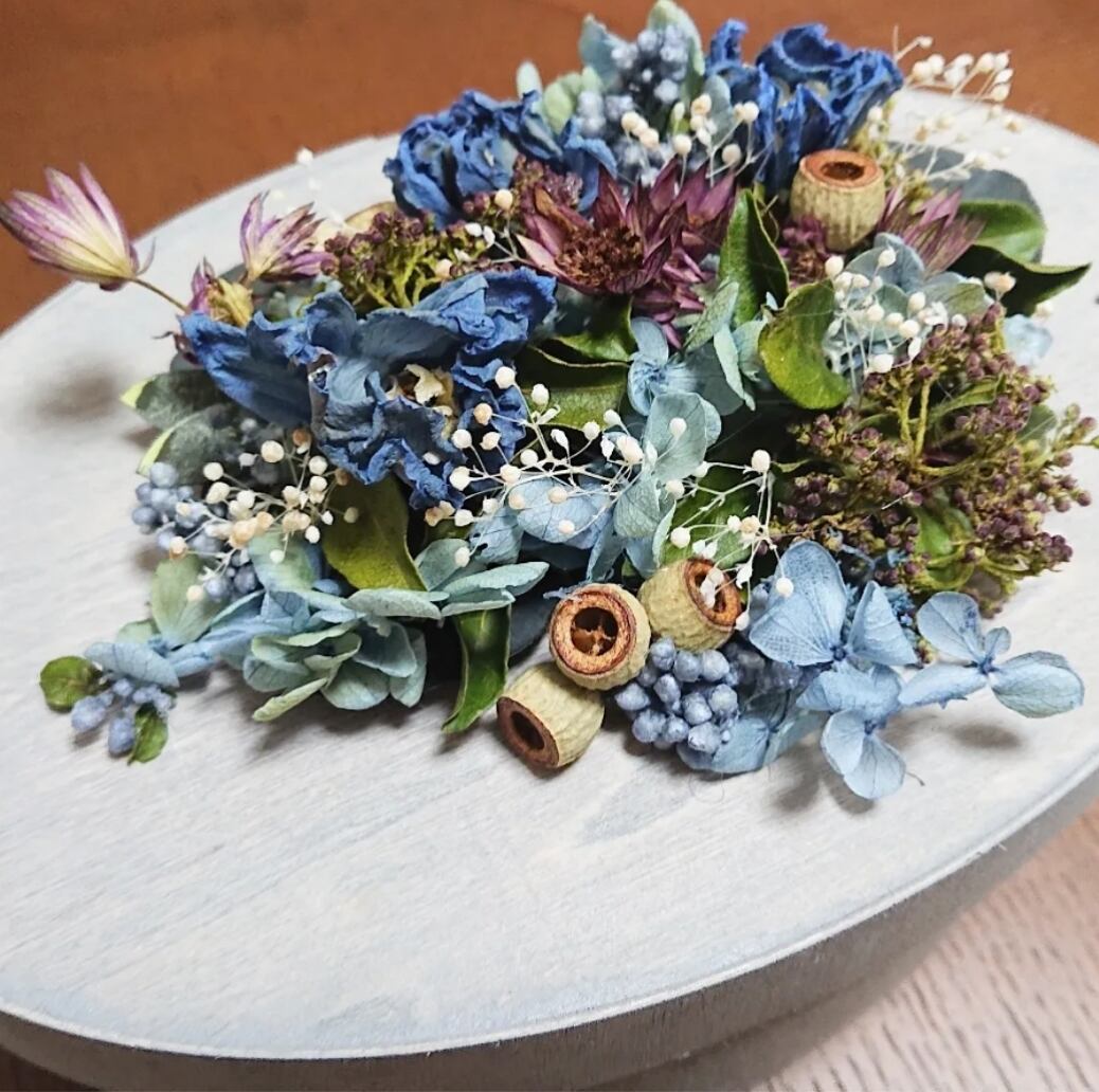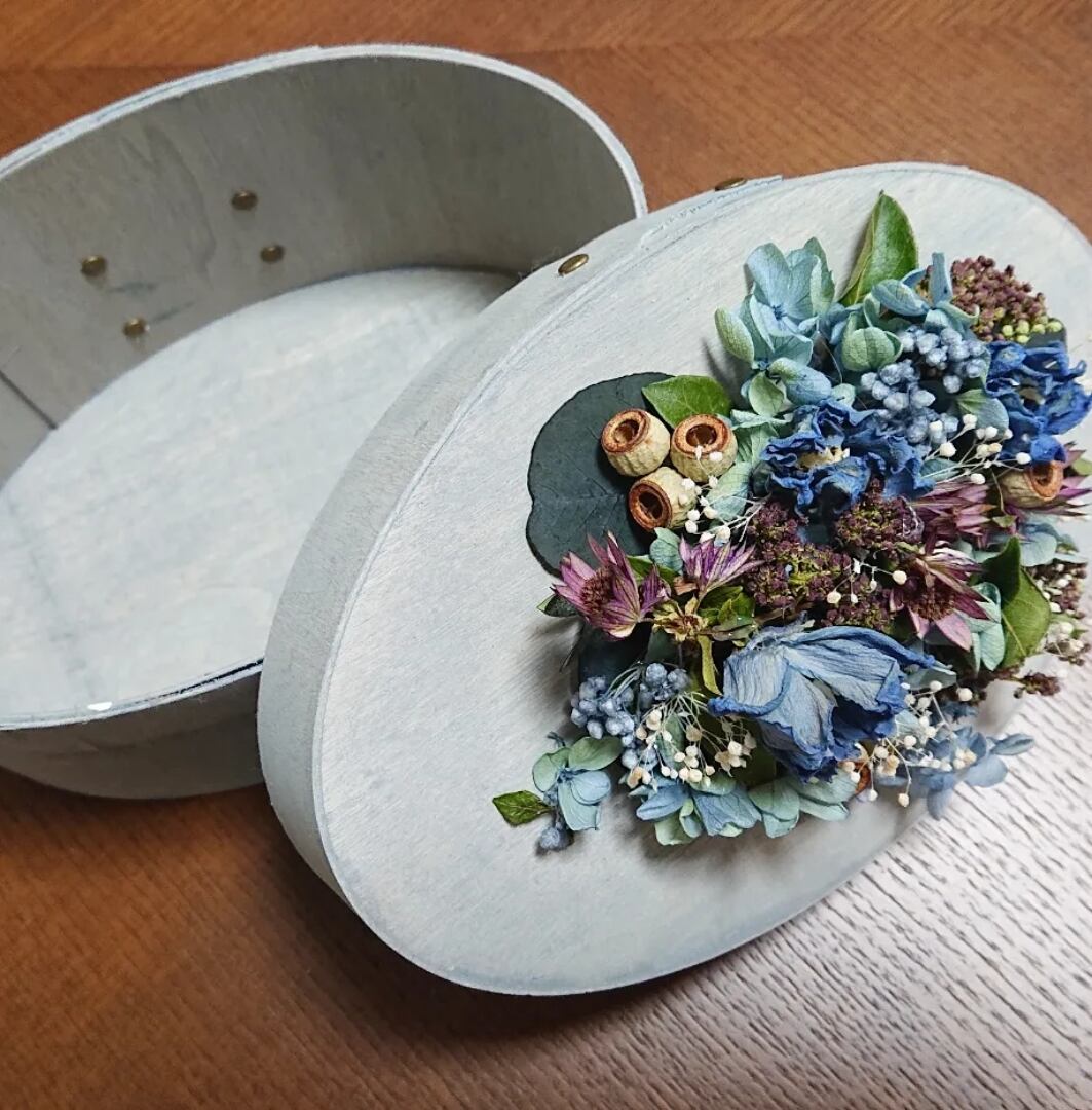 木のオーバル型のボックスに自家製のドライフラワーや品質にこだわったプリザーブドフラワーを飾りました。